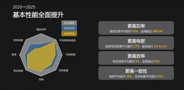 验证结果清晰量化了电堆产品从2020年至2025年六年间的发展过程,数据显示,六年间电堆额定功率平均提升59%,最高超过 240 kW;额定电流密度平均提升17%,最高超过2.4 A/cm2;体积功率密度、低温起动性能、耐振动冲击等关键性能指标均实现大幅提升。